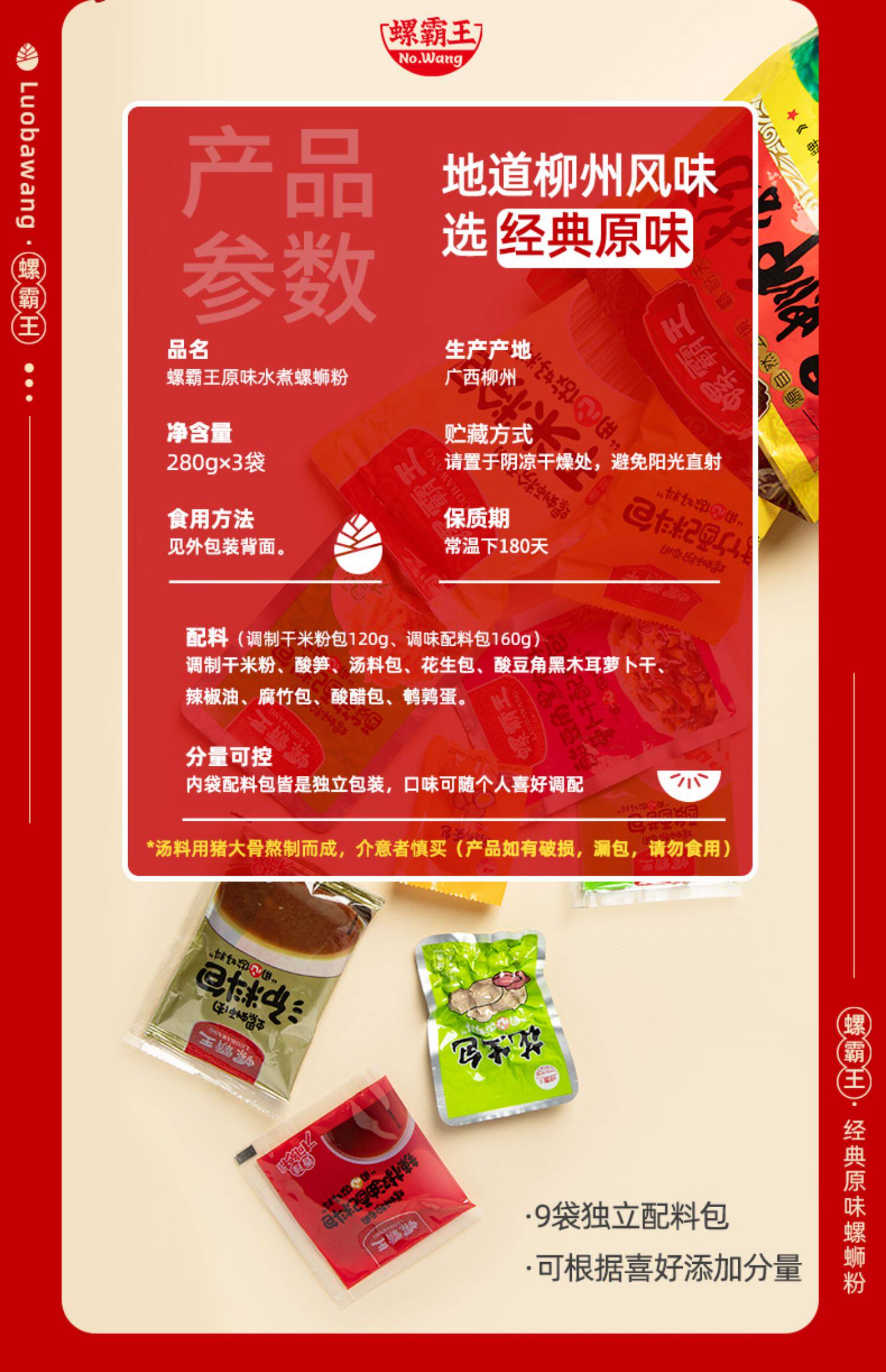 螺霸王水煮螺蛳粉280g*3 【满138送鹌鹑蛋2袋】一入螺蛳粉深似海,说起螺蛳粉,你的鼻子肯定不自觉耸动了!而你的唾液也分泌了!独特的香味,令人吃了忘不了,吃了还想吃,香臭爽酸辣,三次上瘾,居家旅行必备。