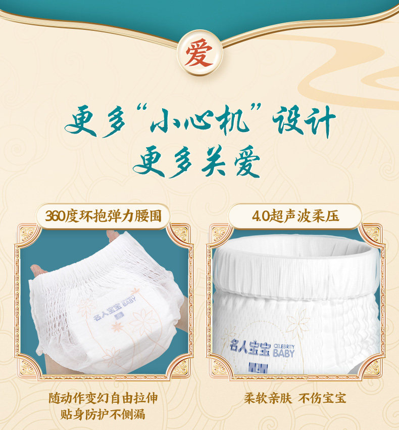 【名人宝宝】轻柔热风面层,ES感接触,细腻呵护,轻薄裸感芯,隐形呵护婴儿肌,云锦360°环绕式腰围,温柔贴身,无勒紧感,宝宝小肚肚不易留红印,给宝宝舒适的穿着体验~ 5