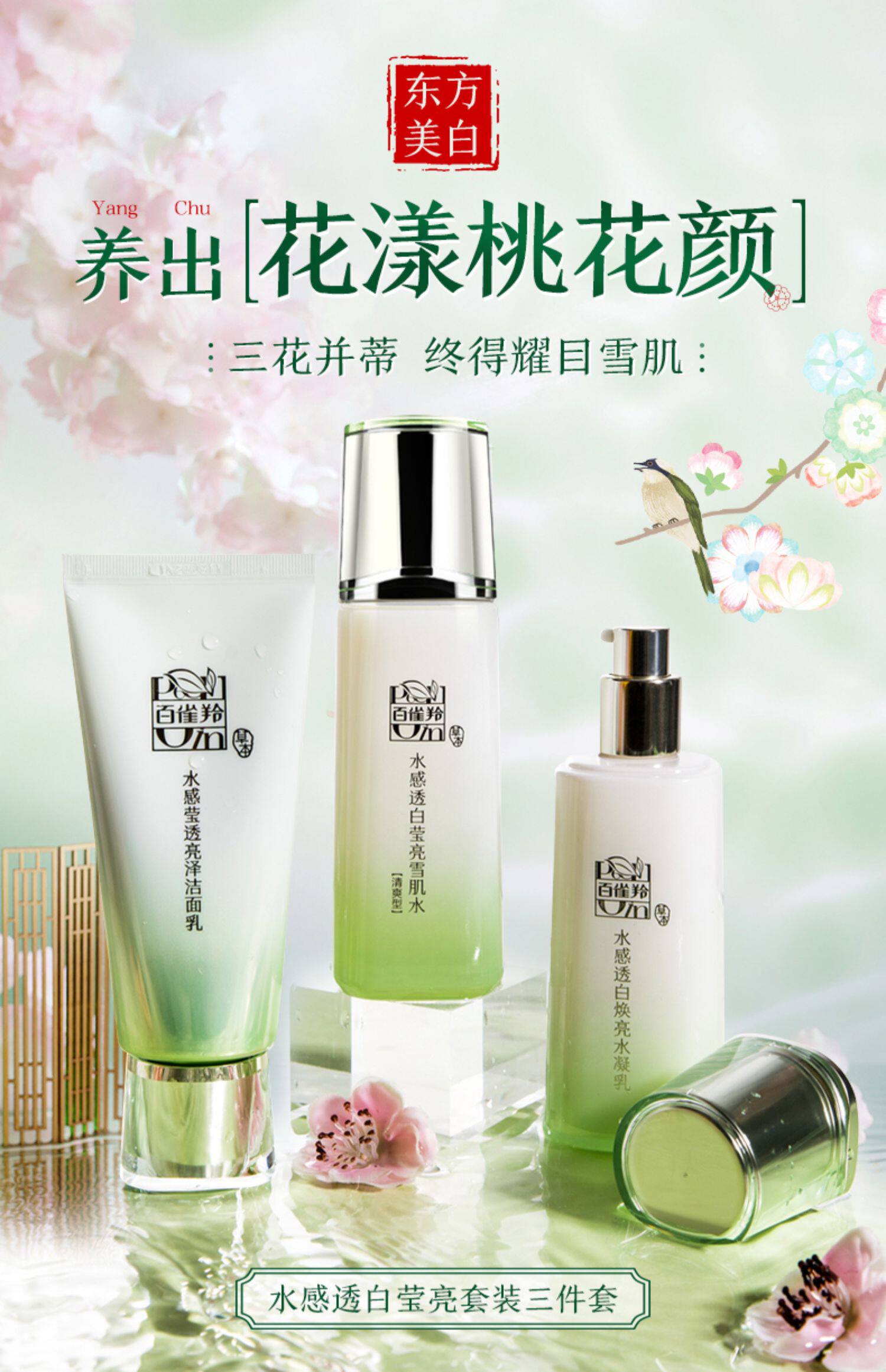 百雀羚水感透白水乳护肤品淡斑保湿 三花并蒂白出活力,一套三种功效 桃花润泽,芍药透白,白术淡斑 肌肤如花,花容月貌