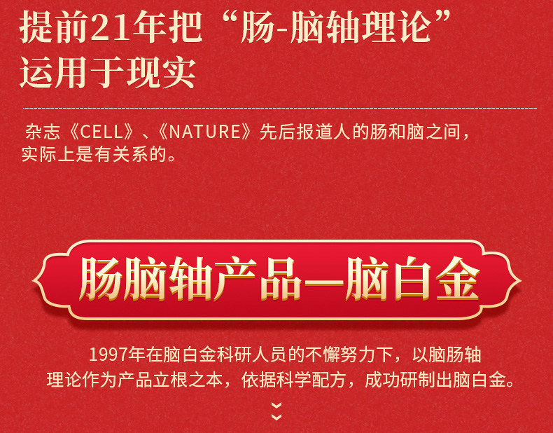 脑白金正品口服液25mlX10支 【第2件半价,只要69!】线下20支要257,咱10支仅78!过年送长辈的健康佳品~脑白金!胶囊+口服液,协同增效,润肠道、助睡眠!每天1粒,吃出年轻态~ 78 138 https://img.alicdn.com/imgextra/i4/2928278102/O1CN01ng1YOq29ilUpx8Ebf_!!2928278102.jpg 天猫 8569 60