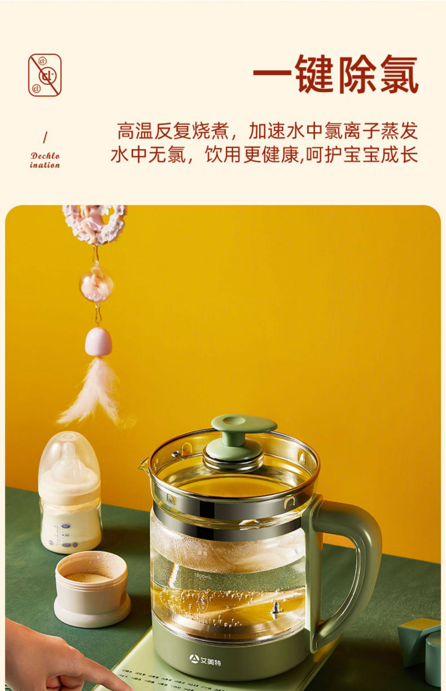 【艾美特】多功能养生壶1.8L 艾美特养生壶家用全自动多功能电热烧水壶煮花茶器燕窝壶1.8L大容量,24H预约,高硼硅玻璃壶身,800W大功率,一键除氯,60s提壶记忆,钢化玻璃操作面板,24项功能,