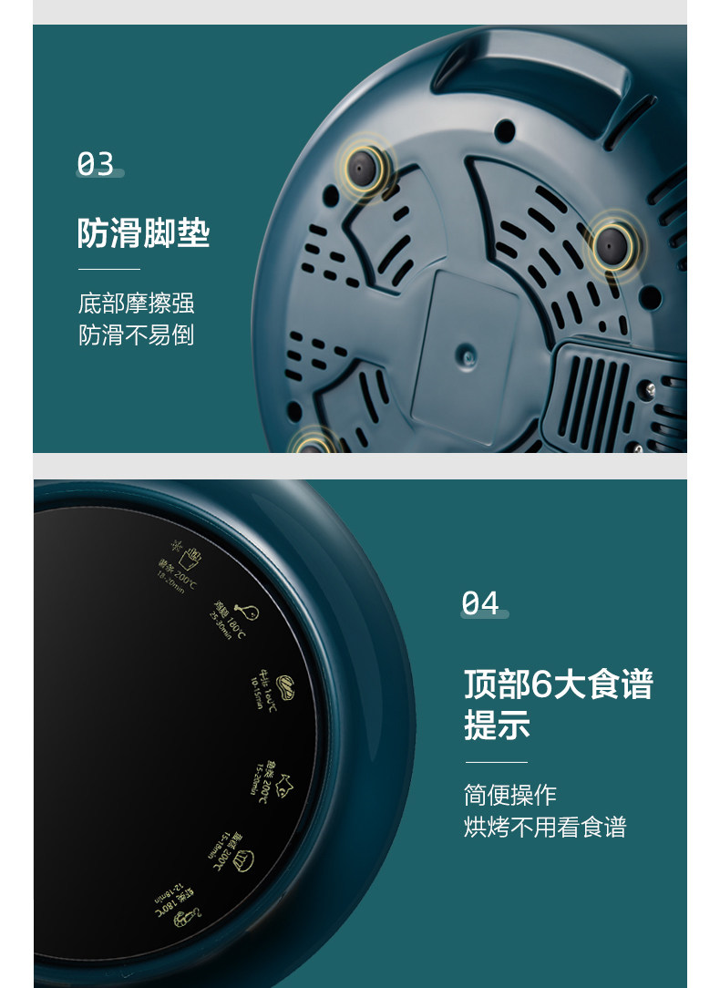 小熊无油空气炸锅家用新款特价 3.6大容量,智能取篮保护,时尚双旋钮操控,无油空气烤,可定时调温,360°热风循环,取锅断电保护,散热系统,防滑脚垫。