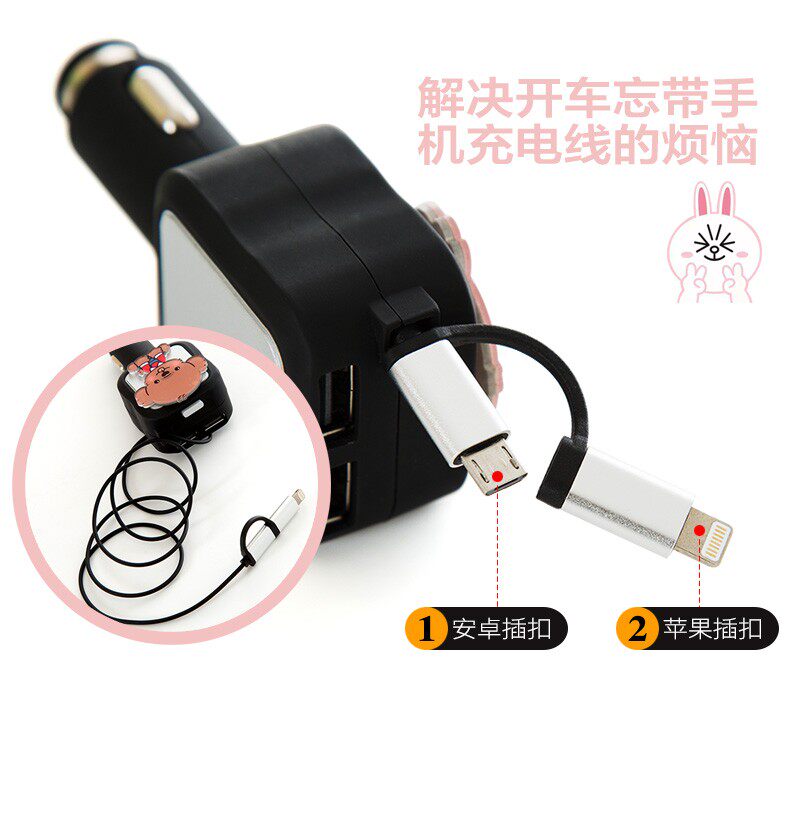 车载充电器多功能充电头双usb车充一拖三 多个usb接口和自带充口,隐藏式充电线,一键收线,多重功能,实用简便,安全智能,适用手机电脑平板行车记录仪等也适用副驾驶距离。多卡通随心选。值得拥有~