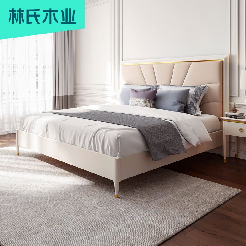 【林氏木业】美式轻奢实木脚双人床 柔软绒布面料,质地柔和手感舒适,光泽度佳,耐磨耐用,不易褪色,五金装饰条,精选优质三胺板,清洁方便,耐磨耐用,使用寿命长,高床侧设计,清洁方便,实木加固排骨架条,承重力强~ 3824 3999