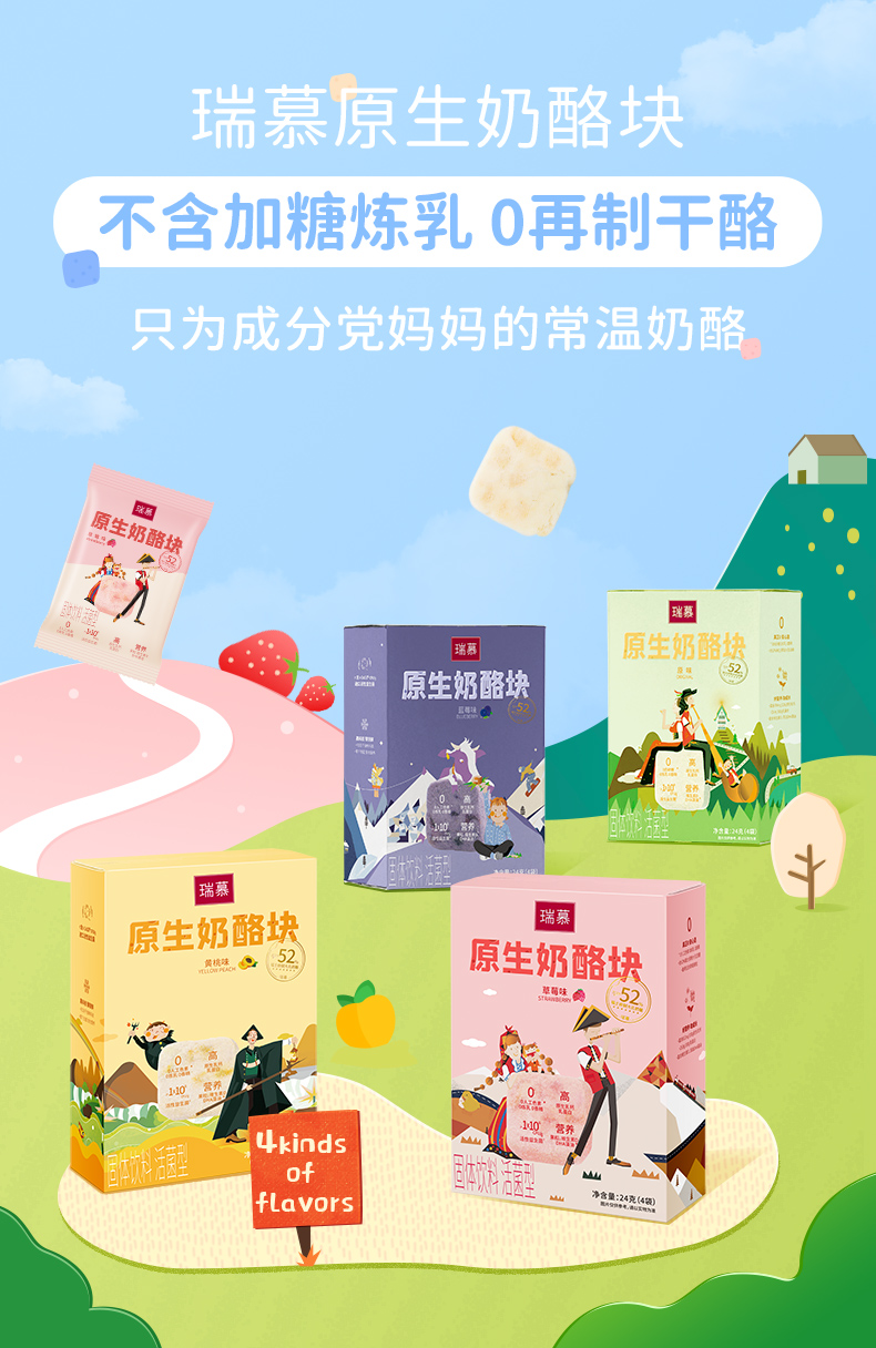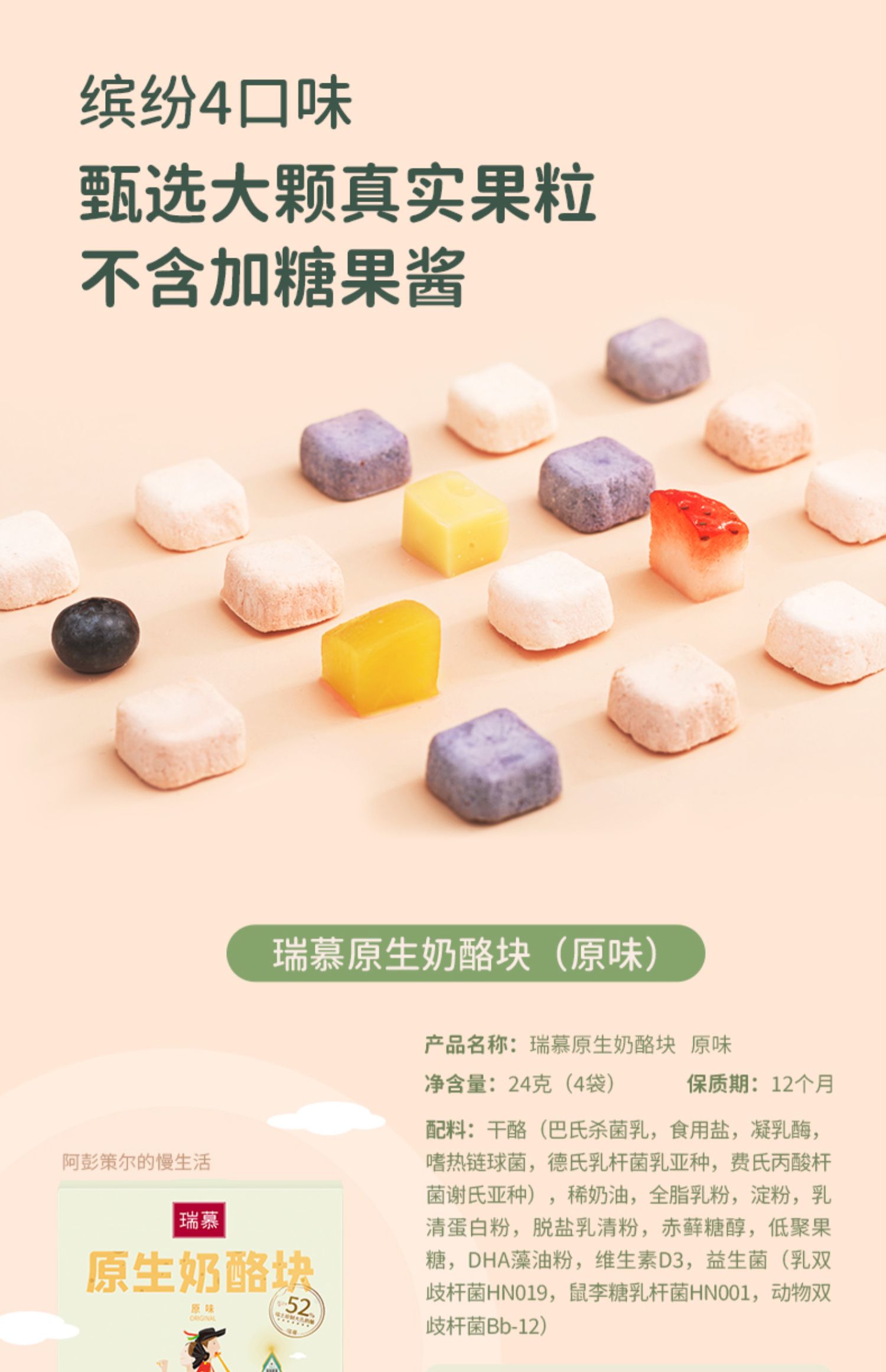 原生高乳钙乳蛋白,无需添加强化剂,干净配料,真实好营养,百万活性乳酸菌,添加DHA藻油,维生素D,为聪明宝宝加油,开袋即食,独立小包装,便携营养,只为成分党妈妈的常温奶酪!