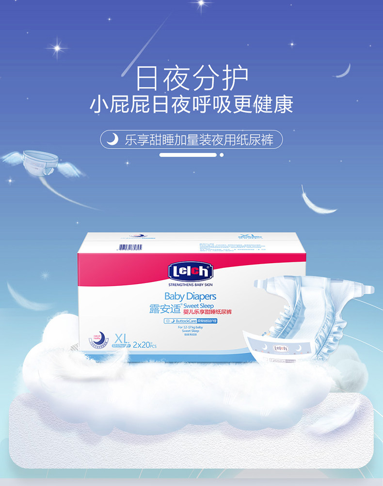 露安适纸尿裤,权威认证。日夜分护宝宝小屁屁。 利艺术浮雕面层,隔空瞬吸,干爽透气,适动透气腰围,日夜分护,甜睡健康!